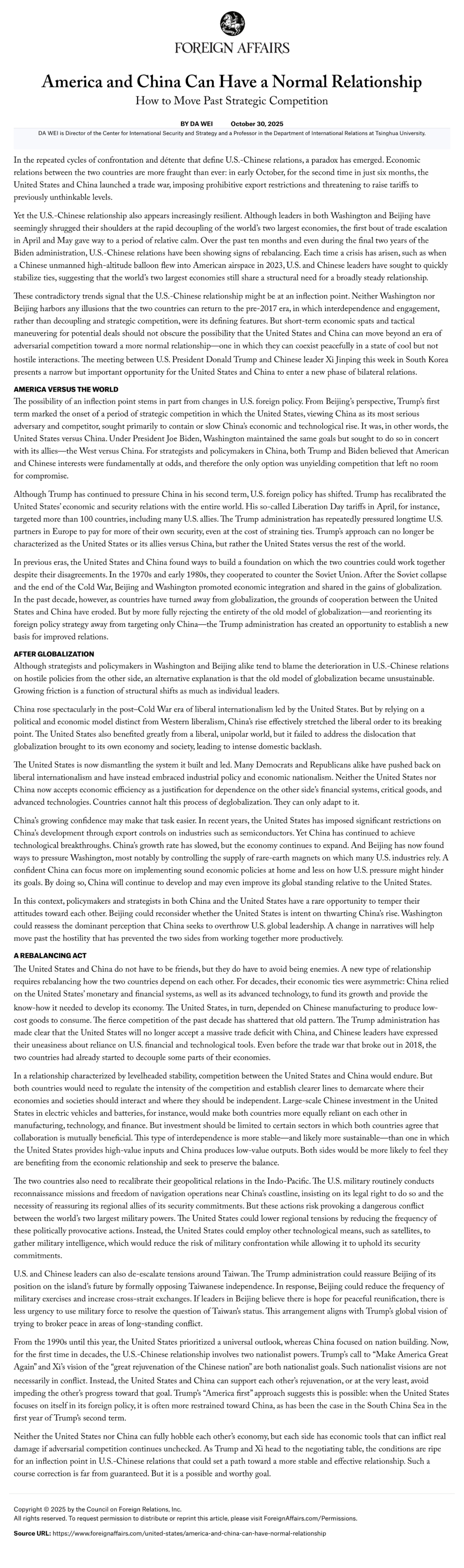 历史上,中美总是拥有一个整体性的合作基础。由于有这个基础,具体分歧就相对容易管控。上世纪七八十年代,中美两国联手应对苏联威胁;冷战结束后,两国共同推动经济全球化并共享收益。但在过去十年,随着各国逐渐远离全球化,中美合作的根基不断削弱。如今,特朗普政府几乎完全否定旧的全球化模式,并将外交重点从“针对中国”转向“重塑对所有国家的政策”,这反而为中美关系建立新的基础创造了机会。
